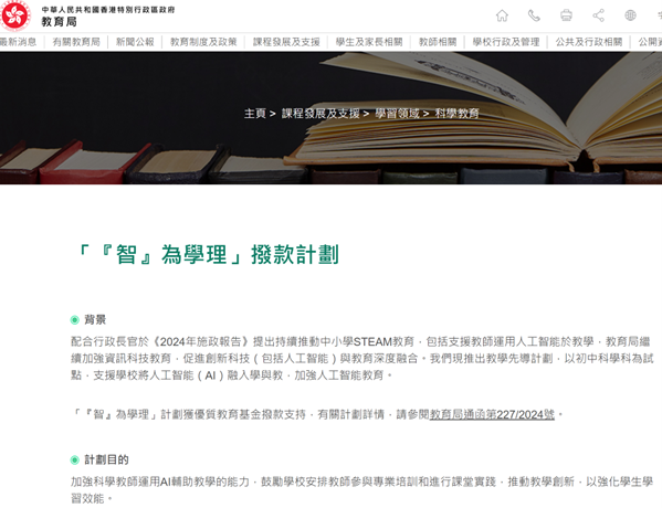 配合行政長官於《2024年施政報告》提出持續推動中小學STEAM教育,包括支援教師運用人工智能於教學,教育局繼續加強資訊科技教育,促進創新科技(包括人工智能)與教育深度融合。教育局現推出教學先導計劃,以初中科學科為試點,支援學校將人工智能(AI)融入學與教,加強人工智能教育。